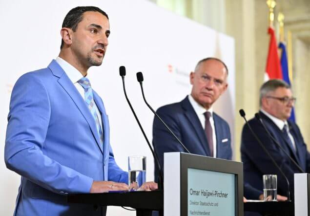 Verfassungsschutz-Chef Omar Haijawi-Pirchner, Innenminister Gerhard Karner (ÖVP) und Staatssekretär Jörg Leichtfried (SPÖ) bei der Pressekonferenz zum neuen Verfassungsschutzbericht.APA/HANS KLAUS TECHT