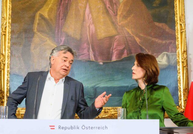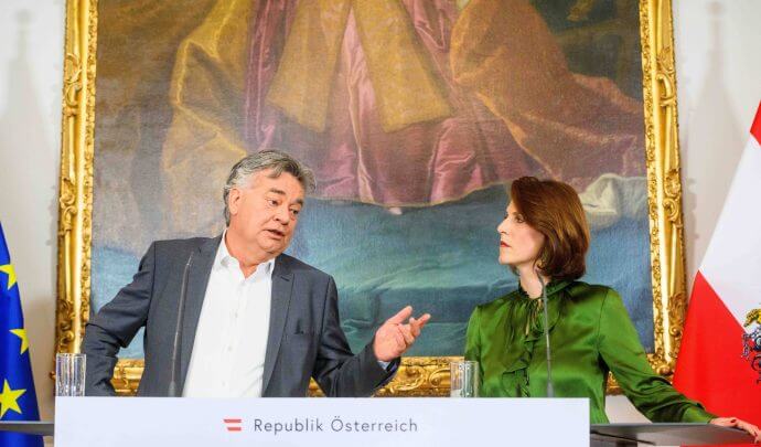 Pressekonferenz zum Informationsfreiheitsgesetz am 5. Oktober 2023 mit Vizekanzler a.D. Werner Kogler und Europaministerin a.D. Karoline Edtstadler (ÖVP)IMAGO/ SEPA.Media