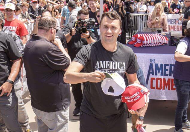 Charlie Kirk bei einer „Tourning Point USA"-Veranstaltung im Mai. Er verteilt Trump-Kappen mit der Aufschrift „Make America great again".IMAGO/SOPA Images