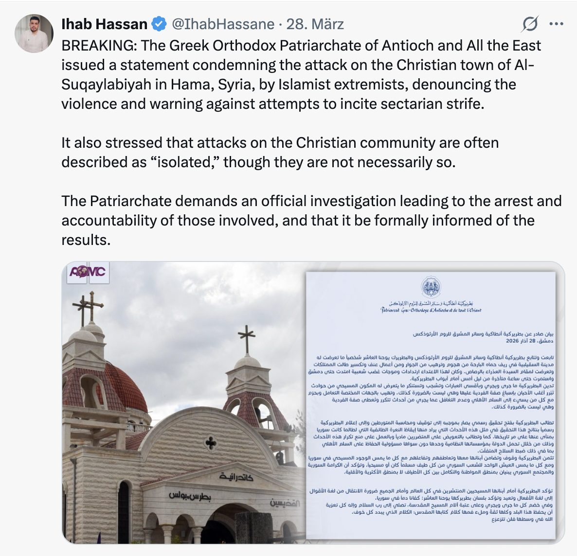 „Die Situation stellt eine ernsthafte Bedrohung für die lokale Bevölkerung sowie für ethnische und religiöse Gemeinschaften dar. Sie ist Teil eines umfassenderen Musters von Vorfällen seit dem Machtantritt von Al Sharaa und verstärkt die Wahrnehmung eines zunehmenden systematischen Drucks auf die syrisch-christliche Bevölkerung.“