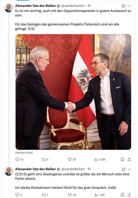 Für eine Überraschung sorgte am späten Mittwochnachmittag Bundespräsident Alexander Van der Bellen. Auf X postete das Staatsoberhaupt ein aktuelles Foto von sich beim Handschlag mit FPÖ-Obmann Herbert Kickl in der Hofburg. „Es ist mir wichtig, auch mit den Oppositionsparteien in gutem Austausch zu sein”, erklärte Van der Bellen.