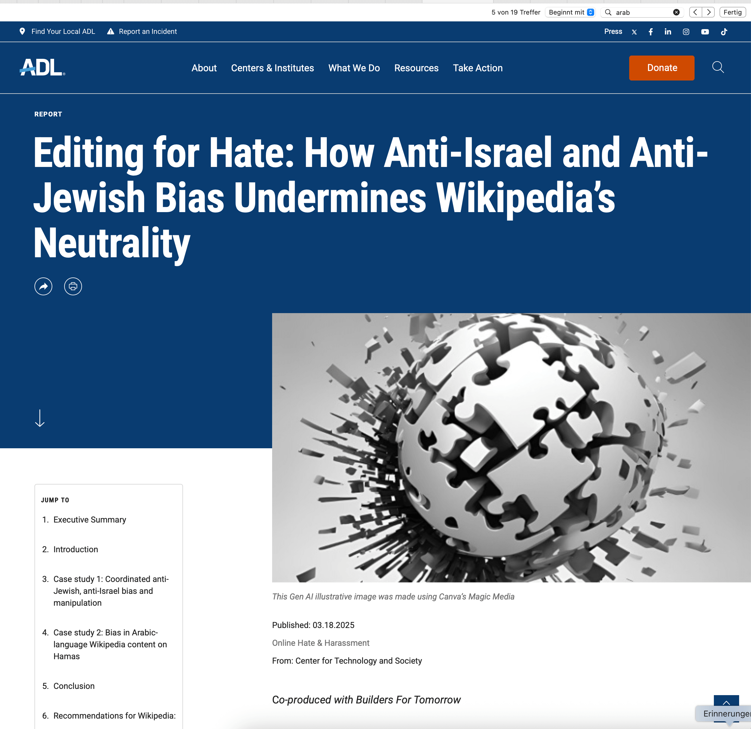 Ein Report der Anti-Defamation League (ADL) enthüllt massive Manipulationen auf Wikipedia. Mindestens 30 Autoren sollen über Jahre hinweg gezielt anti-israelische und antisemitische Inhalte eingebracht haben. Besonders betroffen sind Seiten zum israelisch-palästinensischen Konflikt, wo Gewalt gegen Israel systematisch verharmlost und pro-Hamas-Propaganda gefördert wird.