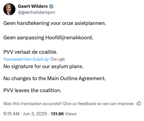 Auf seinem X-Profil postete Wilders ein kurzes Statement: