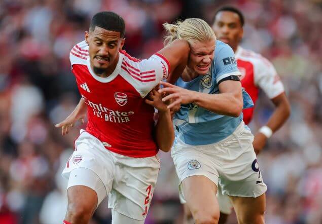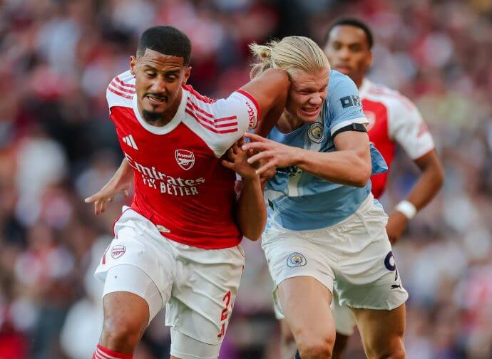 Im Zweikampf: Arsenal-Verteidiger William Saliba (l.) & Manchester-City-Torjäger Erling Haaland (r.).IMAGO/News Licensing